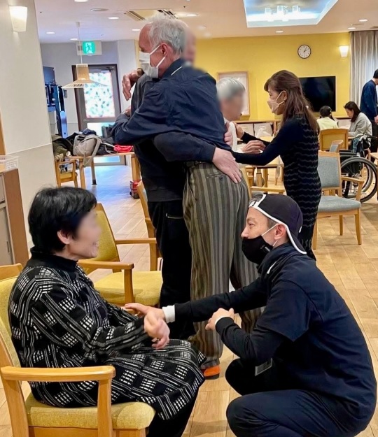 "Aujourd'hui, nous avons reçu la visite non seulement de Patrick, alias Pat-chan, danseur de tango venu de France, et de sa partenaire, Mioko, mais aussi de Misae, de Shiga, de Masami, étudiant à l'université, et de Fuji, de Hands On ! Au total, 9 bénévoles !